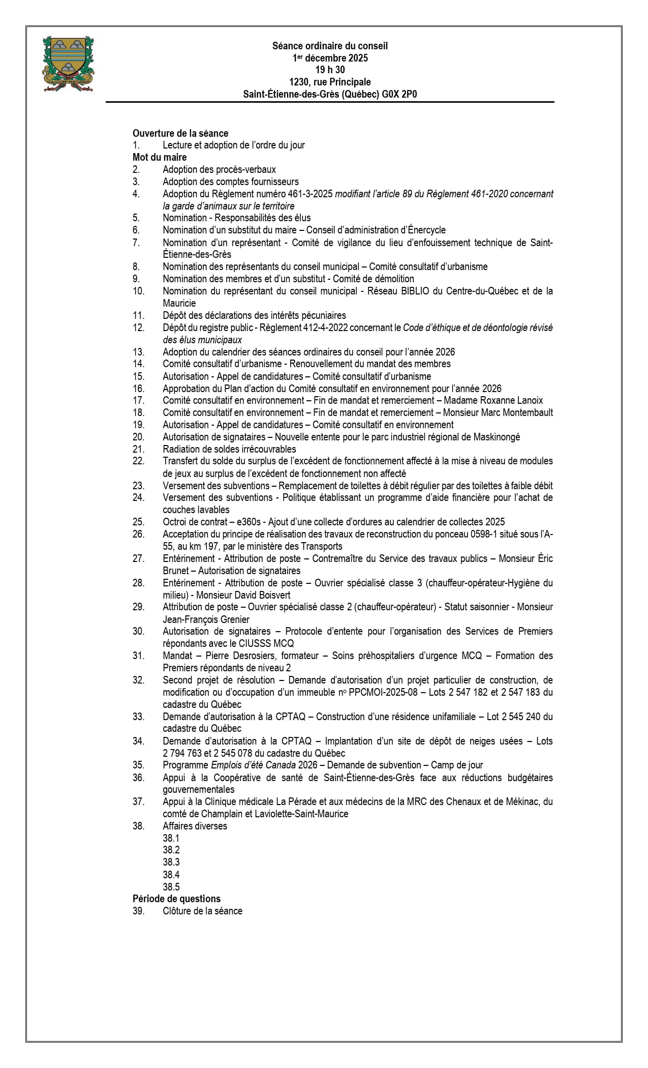 Ordre du jour de la séance du conseil municipal du 1er décembre 2025