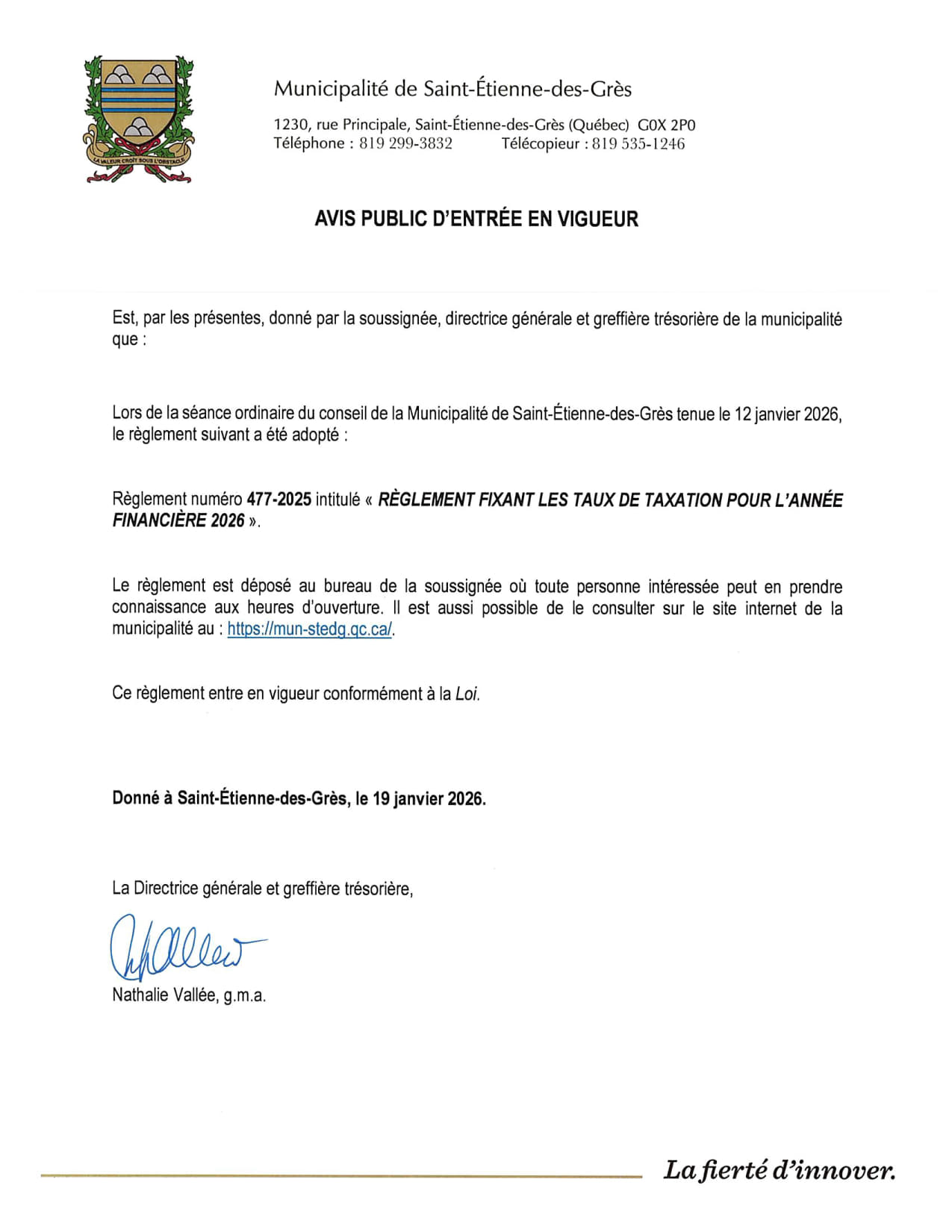 Avis public d’entrée en vigueur du Règlement 477-2025 fixant les taux de taxation pour l’année financière 2026 Accueil / Avis publics et annonces importantes /