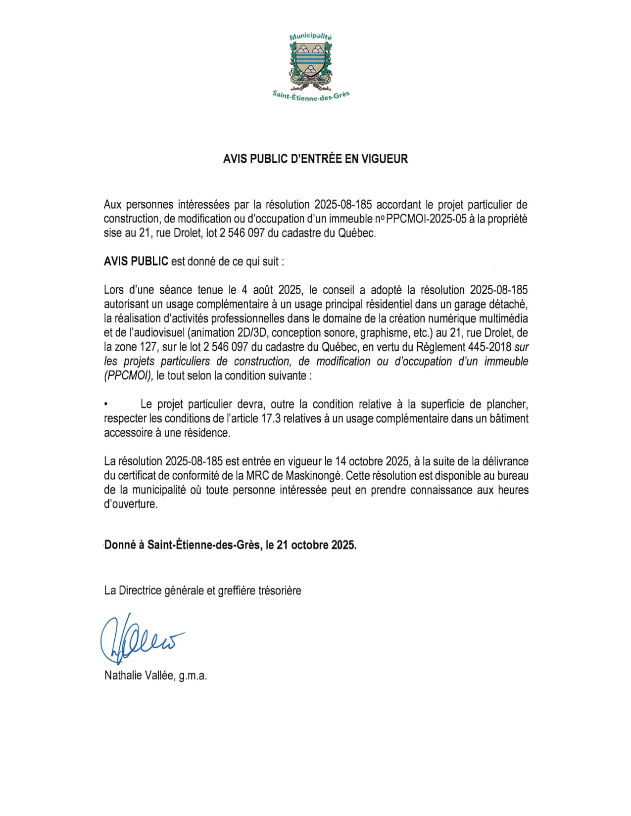 Avis public d’entrée en vigueur – PPCMOI 2025-05 – Lot 2 546 097 du cadastre du Québec Accueil / Avis publics et annonces importantes /