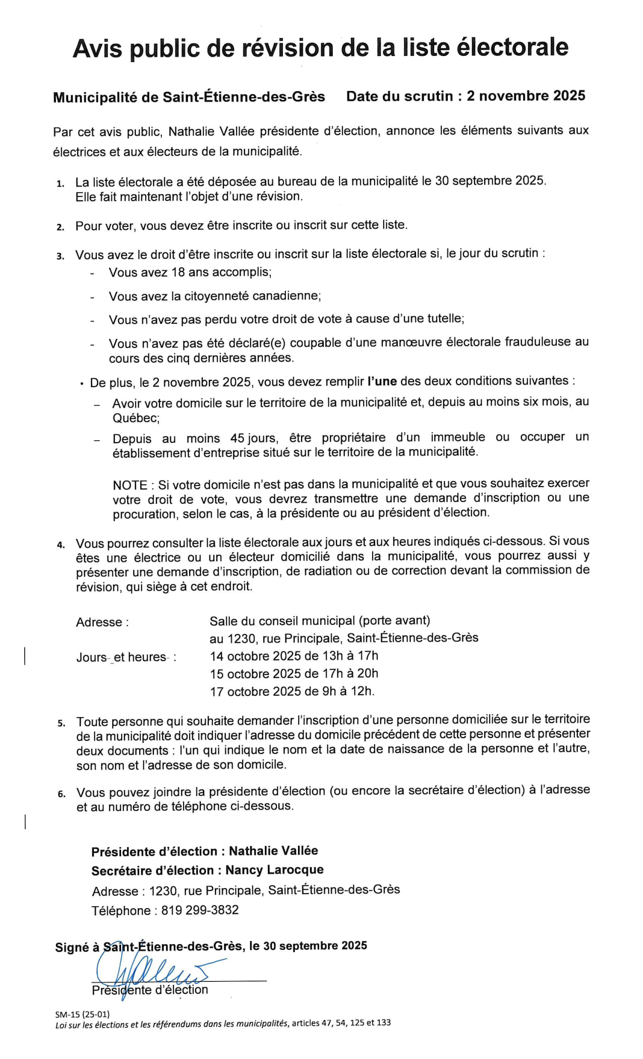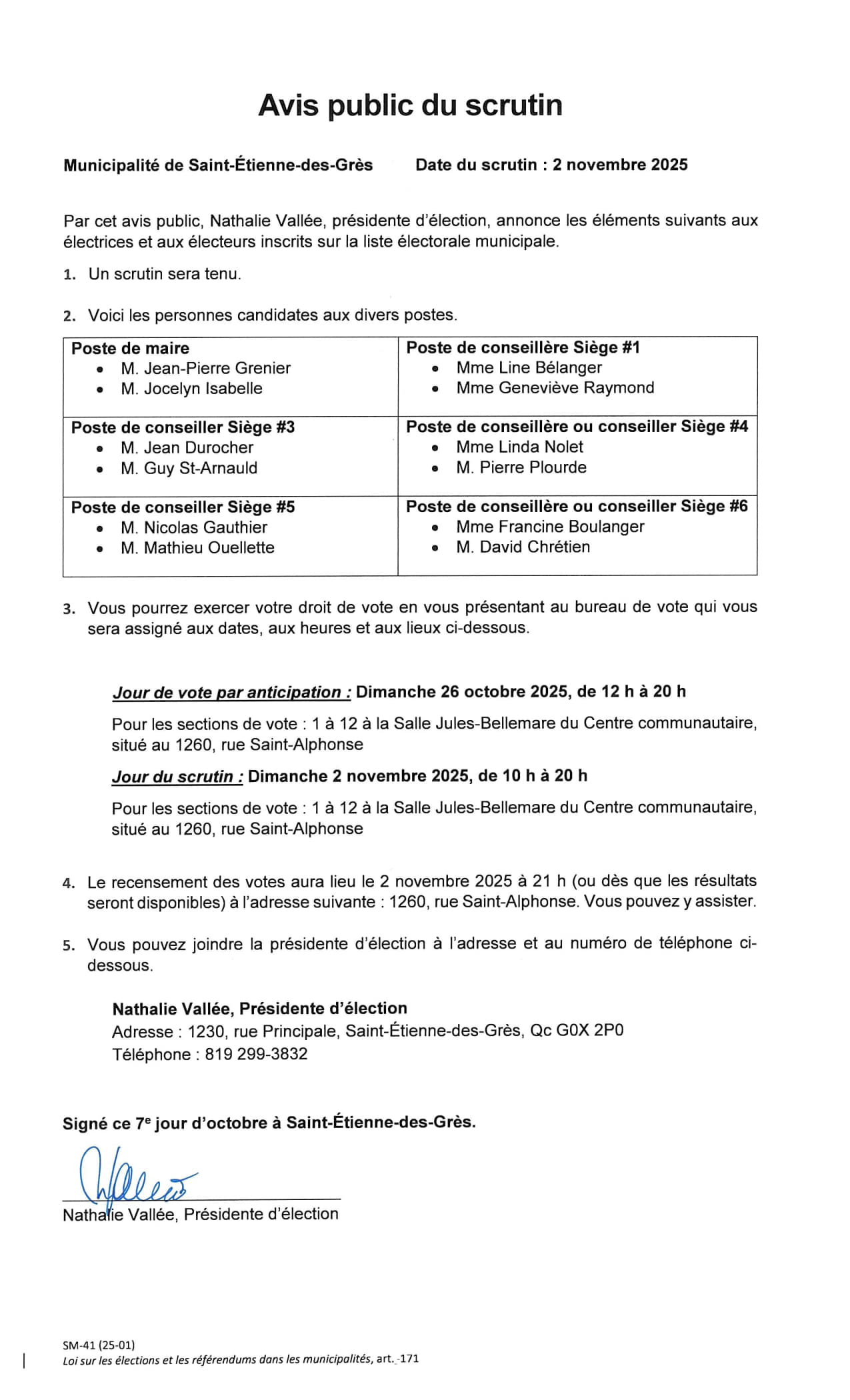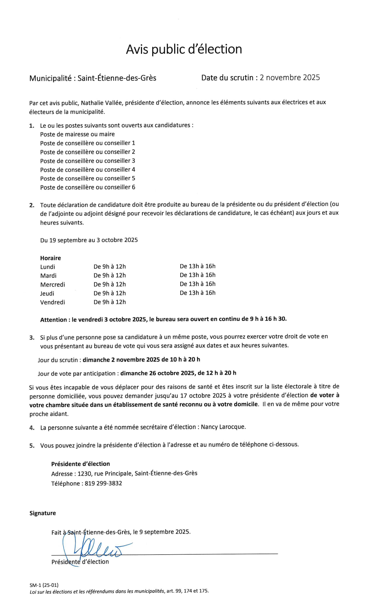 Les élections municipales auront lieu le 2 novembre 2025. Voici l’avis public d’élection: