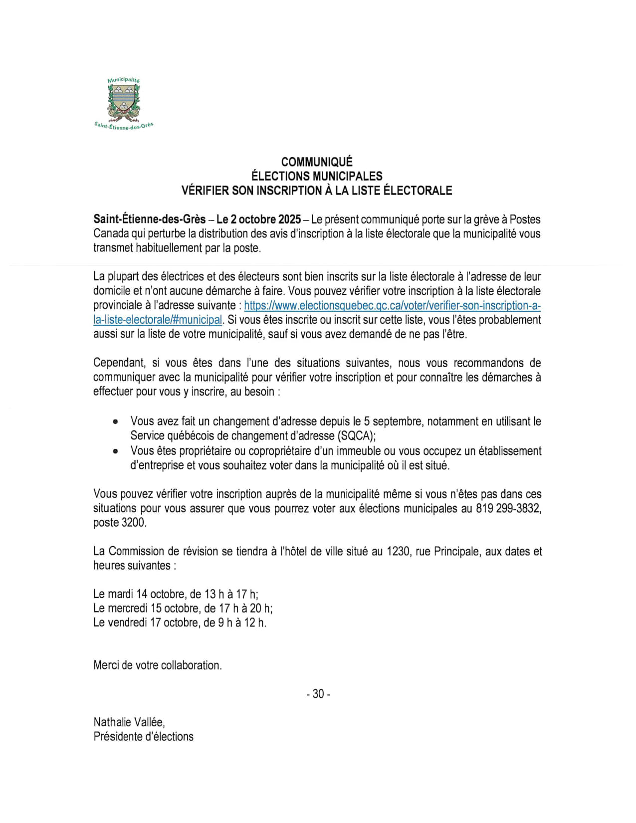 La grève à Postes Canada perturbe la distribution des avis d’inscription à la liste électorale que la municipalité vous transmet habituellement par la poste. Pour savoir comment vérifier votre inscription à la liste électorale, veuillez prendre connaissance du communiqué qui suit: