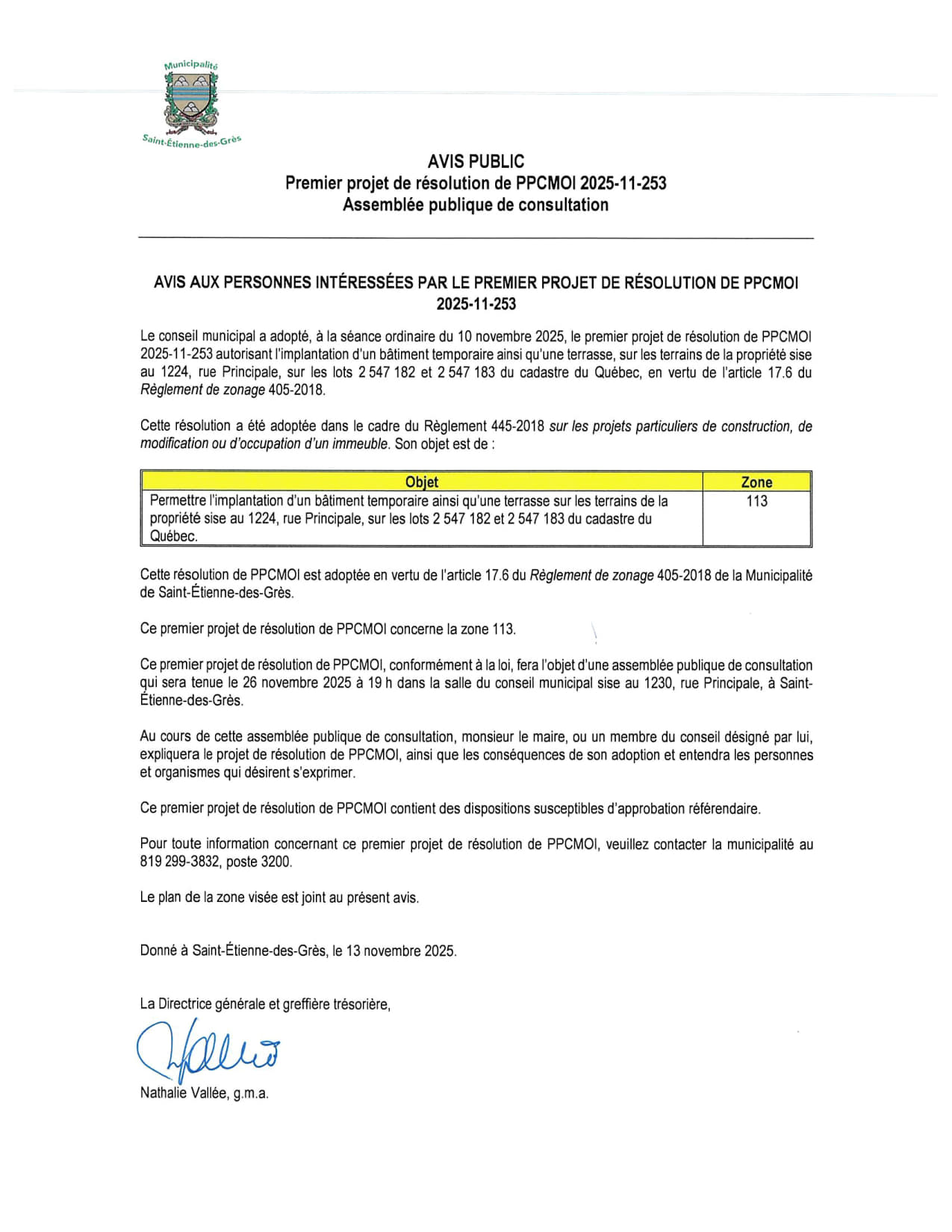 Le Service d’urbanisme a reçu la demande d’autorisation d’un projet particulier de construction, de modification ou d’occupation d’un immeuble no PPCMOI-2025-08 qui consiste à permettre l’implantation d’un bâtiment temporaire ainsi qu’une terrasse, sur les terrains de la propriété sise au 1224, rue Principale, sur les lots 2 547 182 et 2 547 183 du cadastre du Québec.